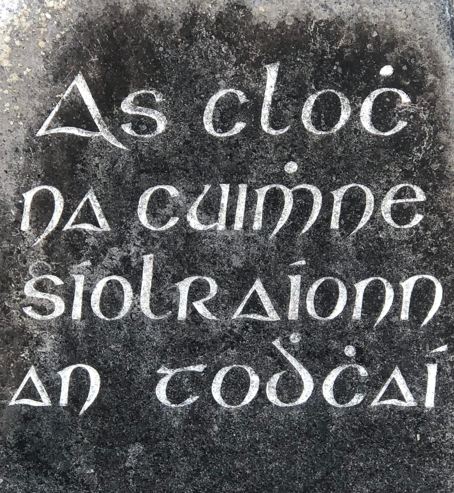The one in today’s photo is another favourite: “As cloch na cuimhne síolraíonn an todhchaí.” You could translate it as “from the stone of memory the future springs forth” or, to turn it around: “the future is borne by the stone of memory.”